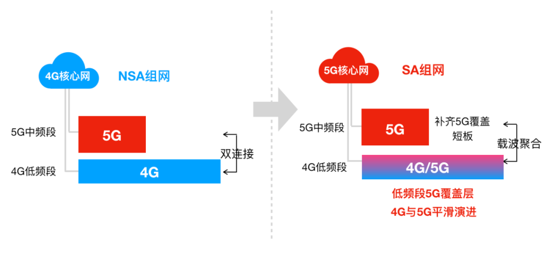 采用動(dòng)態(tài)頻譜共享技術(shù)后,利用4G低頻段,可快速實(shí)現(xiàn)5G SA廣覆蓋。