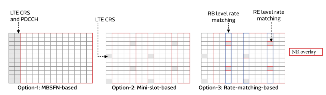即基于在非MBSFN子幀中的CRS速率匹配,常用于NR數(shù)據(jù)信道。其通過(guò)UE執(zhí)行LTE CRS使用的RE打孔,以便NR調(diào)度程序知道哪些RE不可用于在PDSCH上進(jìn)行NR數(shù)據(jù)調(diào)度。該選項(xiàng)的實(shí)現(xiàn)可以是RB級(jí)的,也可以是RE級(jí)的。
