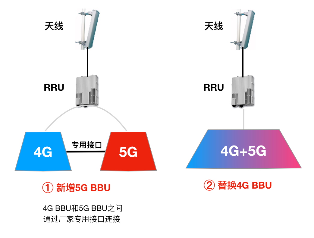 在基帶部分,動(dòng)態(tài)共享頻譜有兩種部署方式:一種是在原有4G BBU的基礎(chǔ)上新增5G BBU或基帶板,兩者之間通過(guò)廠家的專(zhuān)用接口快速調(diào)度;一種是用共享4G和5G的BBU替換原來(lái)的4G BBU。