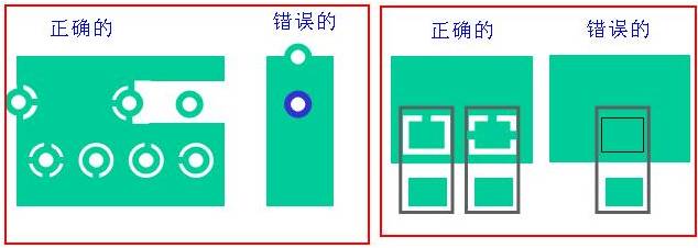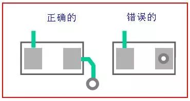 如果采取左邊的方式的話,在焊接或者維修拆卸元器件時比較困難,因為溫度通過鋪的銅把溫度全面分散導(dǎo)致焊不上魚差不下。