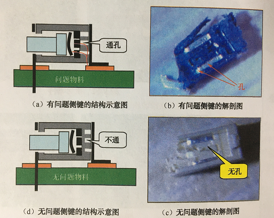 對比有問題物料和無問題物料(同品牌),結構上有一個不同,就是有問題的物料上有小孔直接通內(nèi)部觸條,而無問題物料小孔為非通小孔,如下圖所示。