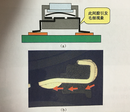 有時封裝材料使用不當也會出現(xiàn)很小的間隙,這很容易導致焊錫“毛吸”進去,如下圖所示。