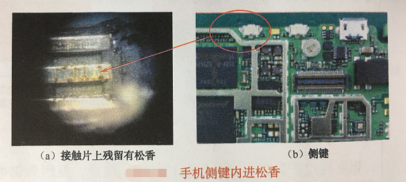 手機側鍵焊接后出現(xiàn)20%以上的斷路,打開后看到內(nèi)部接觸片之間有松香痕跡,如下圖所示。